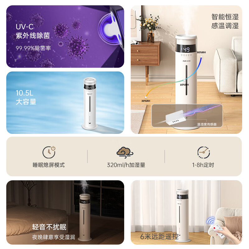 奥克斯(AUX)加湿器 落地式家用大容量卧室婴儿空气加湿净化器除菌大雾量办公室空调取暖器伴侣